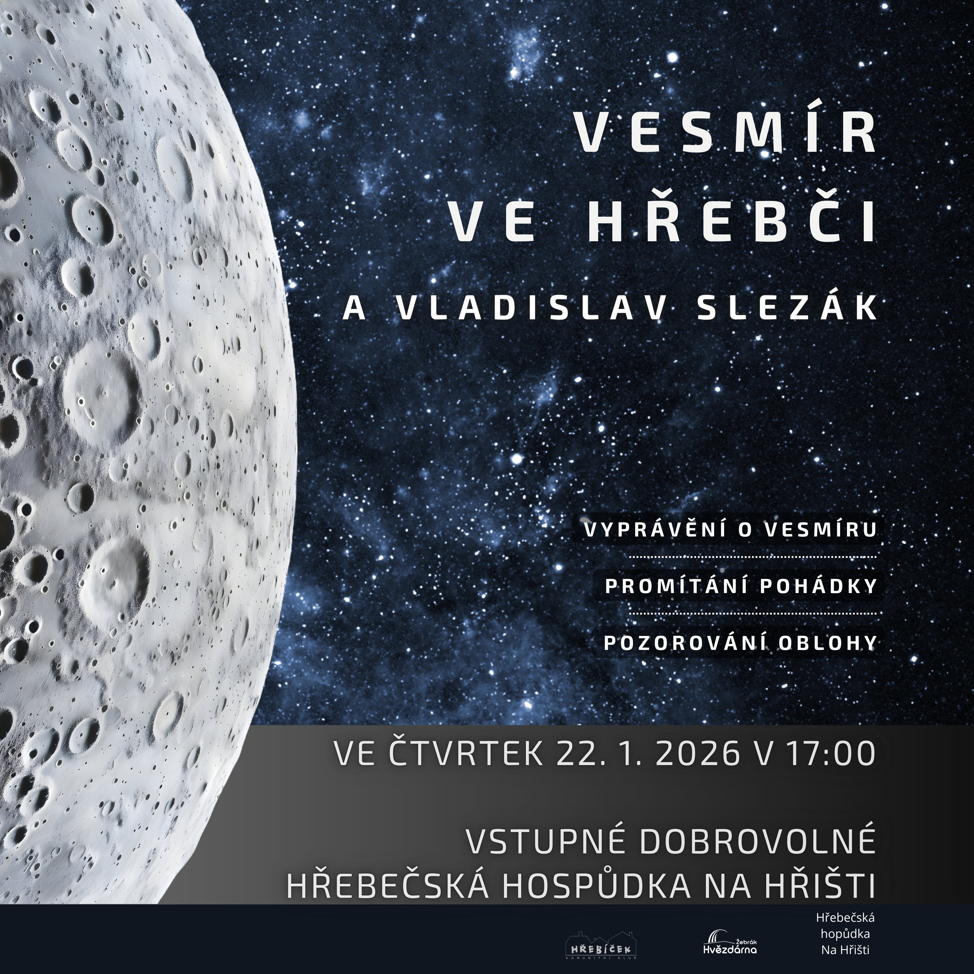 Největší akcí Hvězdárny Žebrák bude Hvězdárium 19. a 20. června. Rovněž v roce 2026 plánujeme řadu tradičních akcí. Den hvězdáren, Noc vědy, Perseidy s Michalem Šindelářem a tentokrát i pozorováním částečného zatmění Slunce, Letní kino s filmem GRYGAR, akce na hradech Žebrák a Točník, akci s veterány atd. Chystáme i řadu programů pro školy a veřejnost, pro Klub malých hvězdářů, nové programy atd., a to i v planetáriu na náměstí, pokračovat bude i pravidelný video seriál V záři hvězd.
