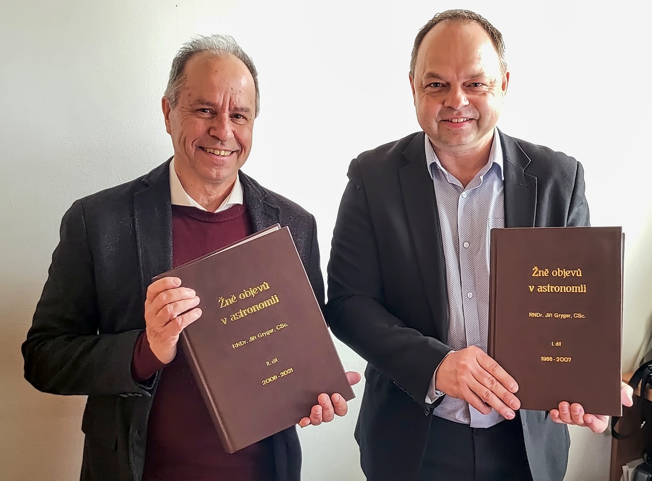 V sobotu 21. března proběhla v pražském planetáriu oslava 90. narozenin astrofyzika a popularizátora astronomie RNDr. Jiřího Grygara, CSc. a zároveň dalšího člena Ebicyklu Jiřího Komrsky. V programu zazněly sklady Williama Herschela v podání Komorní dechové harmonie Brno pod vedením Zdeňka Mikuláška, gratuloval Daniel Stach, Jakub Rozehnal i zástupci Astronomického a Fyzikálního ústavu a České astronomické společnosti. Mimo obrovské množství darů byla předána i tištěná podoba Žní astronomických objevů Jiřího Grygara. Ještě jednou přejeme všechno nejlepší.